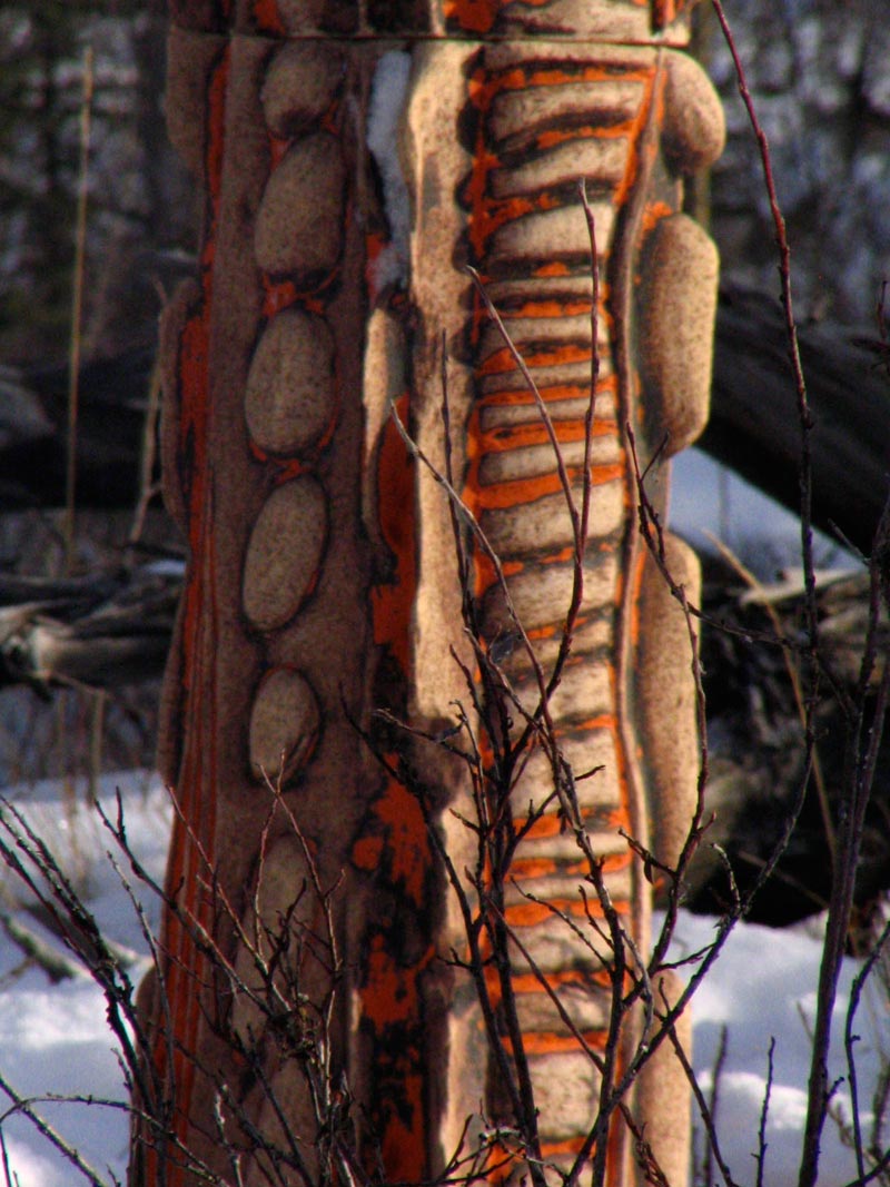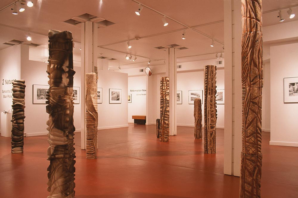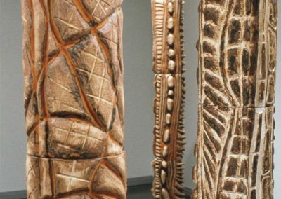 “Samantha Dickie’s massive columnar sculptures are imprinted with marks and colour that hint at seaside transformations, charred remains of a forest fire, or ancient marks gouged into wood or stone. Samantha’s explorations move from the micro to the macro – from a single stone and its textural markings to the grandeur of mountains and rivers. Tranquility and the forces of nature live together on Samantha’s ceramic columns, a textural, rhythmic feast for the eye… [Stand] is an exploration of organic forms that leans towards abstraction; a place where the viewer recognizes aspects of his or her own self”.
