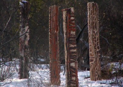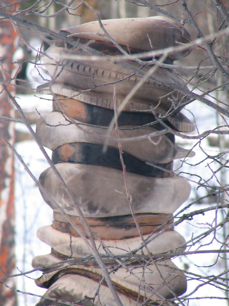 Stand is an exploration of visual narrative created through dynamics of scale, mark-making, and the contextual environment. Stand continues the Imprint installation into a new exploration of scale. Ten large towers, ranging from 2 to 7 feet tall, were hand-built, carved, and smoke fired.